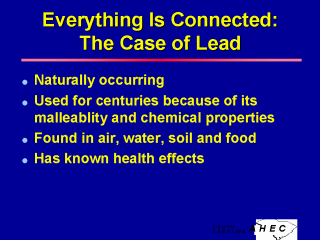 Lead is a familiar example of the consequences of the connectedness in our environment. It is used in plumbing and was made into drinking vessels in Roman times. It is in crystal, cans, paint and glazes. Although banned in 1978, leaded paint is still present in older homes. More than 80 per cent of US homes built before 1978 - some 64 million - contain lead paint. (Environmental Health Threats to Children, p. 3). Whether in poorly maintained homes or and in homes in restoration, lead-containing paint chips become airborne in the breathing space for a brief time, and then end up in nearby soil. Lead from gasoline emissions, regulated in 1973, precipitated out of the air and was captured in the soil. Lead in soil does not decompose. The remedies for lead contamination also have a chain: prevention, education, screening (both the patient and the source), mitigation or treatment (in the individual and the environment), and authority for regulatory and remedial action in public policy. See: Berney, D. “Round and Round It Goes: The Epidemiology of Childhood Lead Poisoning, 1950 - 1990,” The Milbank Quarterly, Vol. 71, No. 1, pp. 3 - 39, 1993. |