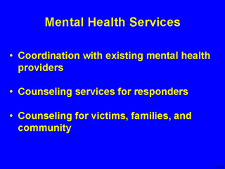 counseling services. The effects of a mass casualty, regardless of the agent involved will produce huge numbers of psychogenic casualties. The mental health system needs to prepare for this eventuality. We’ve come to learn many lessons from domestic airplane crashes and the Oklahoma City bombing. These are being incorporated into our plans and response procedures. |