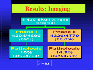 | By comparison head X-Rays were performed in 89% (Phase I) and 88.6% (Phase II) of the children, where 89% of the first group giving normal and 85.1% about the second group. Any way if we analyzed the Pathologic results only 10% corresponded at the first group and 14.9% at the second phase. There was a little statistical difference. |