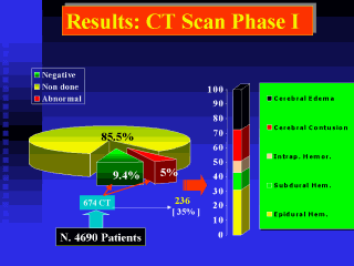 | In this presentation I show you that only 5% (of the total sample) was ABNORMAL , that corresponded at 236 CT (or 35% of the Total CT scan ordered 674) and 9% were negative or normal results. |
