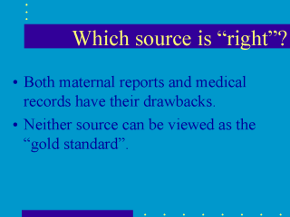 readings: Edwards WS, Winn DM, Kurlantzick V, Sheridan S, Berk ML, Retchin S, Collins JG. 1994. “Evaluation of National Health Interview Survey Diagnostic Reporting.” Hyattsville, Maryland: National Center for Health Statistics. Vital and Health Statistics. 2(120). Harlow SD, Linet MS, 1989. “Agreement between questionnaire data and medical records: The evidence for accuracy of recall,” American Journal of Epidemiology. 129(2):223-48. Marquis K. 1984. “Record checks for sample surveys,” In: Jabine T, Loftus E, Straf M, et al., (eds.): Cognitive Aspects of Survey Methodology: Building a Bridge between Disciplines. Washington D.C.: National Academy Press. |