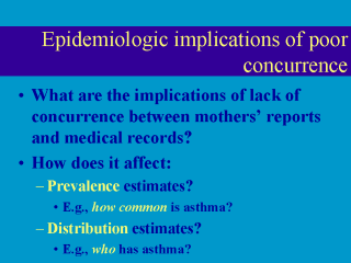 Another important question is how the lack of concurrence affects estimates of asthma distribution among children in the general population, in other words, which children have asthma? Put differently, is there systematic bias in one or both sources that cause the estimates derived from each to differ, beyond the expected random statistical variation?