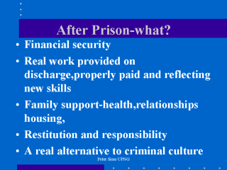 imprisonment is a fact of life and a punishment that society will need to use. This punishment must be used sparingly and appropriately-a prison sentence needs to be planned and delivered with agreed aims and objectives, targets and goals and with a series of privileges earned en route. The prisoner needs to recover self respect, this is an opportunity to acquire basic skills like literacy and skills in the factory or office with the chance to do real and paid work in prison. The prisoner can save for his release, continue to support his family and contribute to the costs of the prison. The health of the prisoner is key, and the idea of self care and recovery from drug and alcohol abuse is possible with proper records linking up with care before prison and afterwards. The prison needs to be much more open to society,many more staff should be non-prison e.g. the medical service and nursing service should be part of the outside service to the whole and wider community.Teachers, probation officers, social workers should be constantly working across the prison/community interface. Prison warders should spend some time working regularly in the wider community. There is evidence that more women working in prison makes an important difference to the ethos of care. |
