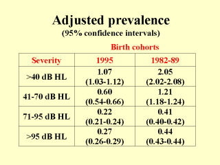 estimates rise to those in the table. Thus the prevalence at age 9 is estimated to be nearer to 2 per 1000 live births than the previous reports of 1 to 1.5 per 1000. (See reading list at end of lecture) The rise in prevalence from age 3 to age 9 is 81% in observed values (previous slide) and 92% in adjusted values for impairment >40dB. |