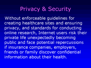 | Medical and health websites differ from other Internet sites because they deal with personal information about people’s health. Many Internet users believe their movements are not being tracked, that they can visit websites for information about controversial subjects—AIDS, Herpes, Suicide—without fearing repercussion. |