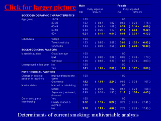 the former Soviet Union: Sociodemographic factors: age, urban/rural status, region of residence, education, occupation and nationality. Material factors: income, self rated material situation and unemployment. Psychosocial factors: Social position, change in social position over the last 5 years and involvement in social networks measured using marital status, church attendance and communist party membership. Traditional measures of socio-economic status used in the west cannot be assumed to apply in the post-Soviet context. For example, education is not as clear a marker of material status as it is in the west. For this reason, measures of social class and education were considered as demographic characteristics and under material status we considered only variables that more directly measure material position. Age adjusted gender specific odds ratios were calculated for each variable. Then, to allow for potential confounding, a multivariable analysis was performed. The results of this multivariable analysis are presented in the table. |