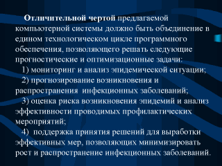 | На основе предлагаемой информационной компьютерной системы может осуществляться оперативное управление эпидемической ситуацией и контроль за выполнением решений соответствующих директивных органов по борьбе с инфекционными заболеваниями, проводиться анализ влияния различных факторов риска на распространение эпидемий, вырабатываться меры по снижению эпидемического риска и повышению эффективности работы санитарноэпидемических служб и здравоохранения в целом. |