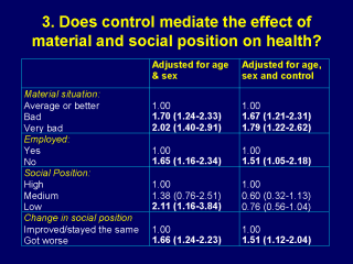 measured using both social and poor material status (data not shown). We then explored whether control accounted for the impact of material and social position on health as shown in the table: By adding control to the model we can see whether odds ratios change – if they do, it suggests that the change was due to control: Can see that the main change is in the odds ratio for social position, which declines from 2.11 to 0.76 in those with low social position. This suggests that the negative impact of low social position on health is accounted for by low levels of control. Control does not however explain (to any great extent) the impact of poor economic position on health. We have already seen that the impact of control on health is independent of other factors including material status. Thus control is important in own right and in explaining impact of social position on health. |