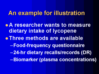 and easy of application. - Food-frequency questionnaire (FFQ or simply Q): This method is cheaper and easier to administer and is the most used method in nutritional epidemiological studies - Dietary recalls/records (R): May be more accurate than the FFQ but could be more expensive and require repeated measurements. These measurements could be correlated. - Biomarker (M): Here lycopene concentrations in plasma are measured. The method may be more accurate but is rather expensive and involving. Because of the cost and time, two methods R and M are applied only on a sub-sample (e.g. 10-20%) of the study subjects. The next slide shows data from a design with three methods for measuring the exposure. |