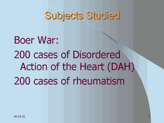in the absence of organic lesion. Cases of rheumatism were without any objective signs such as inflammation or joint swelling. Cases were selected from all surviving Boer War pension files, which are held at the Public Record Office, London. We extracted consecutive files in proportion to their alphabetical distribution by surname. |