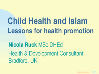 Ruck BA MSc, Dip Heath Education, Reg Nutritionist. I am a consultant in health promotion and health management who has worked in Muslim countries including Egypt, Pakistan and Afghanistan. I have worked in health promotion and training of health professionals for more than 20 years. I was recently involved in producing Policy Guidelines for Hygiene Education in Afghanistan supported by UNICEF, DACAAR and Save the Children UK. I feel there is a lack of training materials for heath professionals who wish to use the Islamic framework for health education. This presentation is aimed at professionals and community leaders who are, or would like to be, health educators in Muslim communities. I would be very pleased to receive comments from everyone who reads this, especially trainers and health educators. Contact: 6 New Brighton Cottingley W Yorks BD16 1UR UK Tel +44 1274 582634 nicola_ruck@bigfoot.com |
