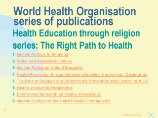 Health series in English and Arabic which are available on the internet: 2. Water and Sanitation in Islam 3. Islamic Ruling on Animal Slaughter 4. Health Promotion through Islamic Lifestyles; the Amman Declaration 5. The Role of Religion and Ethics in the Prevention and Control of AIDS 6. Health an Islamic Perspective |