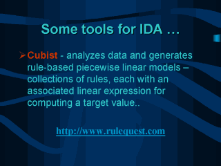 existence of a sample of cases where each case is described by: number of attributes, so called predictors, doesn’t matter if they are qualitative or quantitative values, and one class which is quantitative value (continuous values). Problem is: Find ‘knowledge’ describing relationship between attributes and class, something like: IF (attribute1 is less-equal-greater-then v1 and …attributen is less-equal-greater-then vn) THEN (class is a function-linear-regression of attributes) |