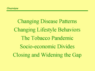 trends which are also local: Changing Disease Patterns Changing Lifestyle Behaviors The Tobacco Pandemic The Socio-economic Divide Closing and widening the Gap |