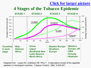 epidemic experiences of the US and UK. First men, or rather boys, and then women, or rather girls, take up smoking (solid lines). Later, the deaths from smoking begin to appear, first in men, and then in women (striped lines). This continues for several decades after smoking prevalence begins to fall. The entire process takes approximately 100 years. Nearly all countries can find themselves at some stage on this continuum. Ask not for whom the bell tolls… Who’s at fault? |