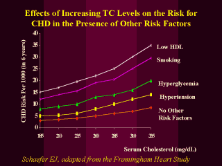 | The Framingham Heart Study showed the effects of increasing total cholesterol levels on the risk for CHD in the presence of other risk factors in men aged 50 years. As shown, low HDL-C poses an even greater risk than smoking, hyperglycemia, and hypertension. |