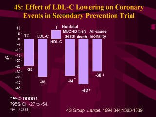 | Subjects: 4,444 (81% men, 19% women)Age range: 35-70 yr Mean baseline TC: 261 mg/dL Mean baseline LDL-C: 188 mg/dL Duration: 5 yr Intervention: Simvastatin 20-40 mg/day |