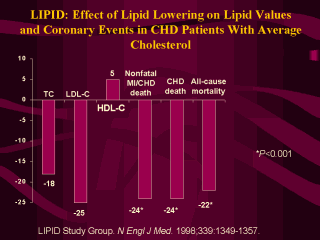 9,014 (83% men, 17% women) Age range: 55-67 yr Median baseline TC: 218 mg/dL Median baseline LDL-C: 150 mg/dL Duration: 6 yr Intervention: Pravastatin (40 mg/day)