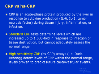 | The standard CRP test is inadequate for detecting the low grade levels of inflammation measured with the hs-CRP test. CRP is an acute phase protein produced in the liver in response to cytokine production. The levels will increase several hundredfold if not a thousandfold during acute infection and tissue injury. High sensitivity assays are needed to detect the CRP levels within the normal range that have been used to predict vascular risk. |