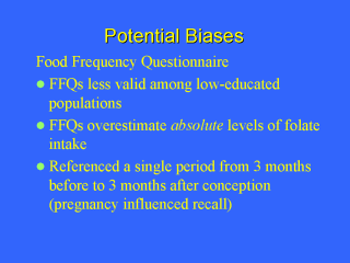 appear weaker than they were - The FFQ doesn’t distinguish postconception time from preconception time - Many women adhere to a healthier diet during pregnancy - These women may have selectively recalled healthy (folate-rich) foods consumed after the neural tube closed (~1 month postconception) rather than their more relevant preconception intake - If case and control women misclassified their exposures to the same extent, estimated odds ratios would have been biased towards the null |