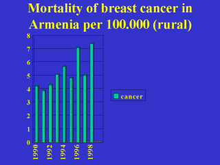 women who have the ability to work till 60 years old. It’s interesting that the left breast is defeated by cancer more often (63-63.9%) than the right breast(31-33. 1%). Probably this fact is explained by the low physical activity of the left hand. Among the illness there were many women with late menarche - after 15 years old-38.24% in 1980-1990 and 17.8% in 1991-2000. In Armenia in the last 10 years there are the problems of iodine deficiency with the increase of the level of endemic goiter. It’s known that the problems of the thyroid gland may affect the function of the breast gland (3 ) .This study was intended to contribute to the understanding of the increase in the level of morbidity and mortality from breast cancer. It can help to work out principles for reducing the level of breast cancer in Armenia. |