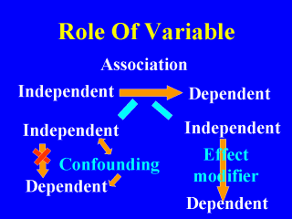 | In a cause-effect association the variables are termed independent and dependent. The independent variable is that considered the underlying cause while the dependent variable is the outcome or the end result. The independent variable could have a confounding role and thus a non-causal relation appears to be causal. Also, the independent variable could interact with another independent variable and modifies its effect. |