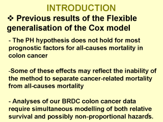 In previous works concerning colon cancer data coming from French registries we have shown that the proportional hazard hypothesis does not hold for most prognostic factors.