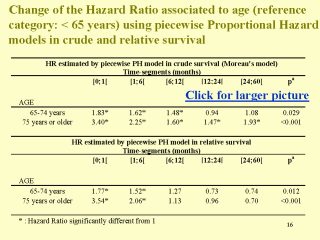 This Table compares the crude and relative survival piecewise estimates of the hazard ratios (HR) associated with age. In the two models, the impact of age is very important during the first month after diagnosis (probably due to the influence of age on the post-surgical mortality). But there is an important difference between the estimates obtained with the two models after two years since diagnosis: The impact of age increases with Moreau’s model although a slight decrease tendency is observed with the relative survival analysis as shown in this figure. The lack of increase in hazard with larger follow-up may be explained by the relative survival approach accounting for the natural mortality in the source population. On the clinical point of view, it is important to be aware that the risk of death for elderly patients is higher only on the post-surgical time, what should be taken into account for therapeutics choices. |