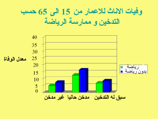 قبل الانتقال ، هذا تحليل من دراسة بجمعية السرطان الأمريكية الوقائية (دراسة رقم 2) التي تنظر إلى سلوك أسلوب الحياة - الحمية والتغذية، التدخين والنشاط الحركى. هنا، نرى بأنّ النساء اللواتي يمارسن الرياضة بانتظام ولا يدخّنّ فان احتمال الوفاة أقل من الثلث في منتصف العمر من النساء اللواتي يدخّنّ و لا يمارسن الرياضة |