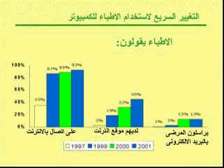هذا المخطط يبين زيادة استخدام الاطباء للانترنت ، انشاء مواقع خاصة بهم و استخدام البريد الالكترونى ان هناك زيادة ملحوظة و مقاومة ملحوظة ايضا لاستخدام السجلات الطبية الالكترونية
