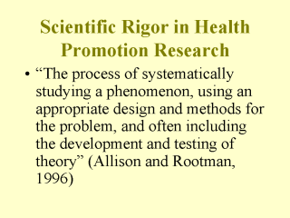 a paper which we published in Health Promotion International (Allison and Rootman, 1996) - To us, scientific rigor refers to the process of systematically studying a phenomenon, using an appropriate design and methods for the problem that is being examined, and often including the development and testing of theory - We suggested that it was more than this, however, involving an attitude of curiosity about the way the world works, with attendant risks of having one's hypothesis proven incorrect - We also suggested a number of reasons why health promotion research needs to be scientifically rigorous, one of which was the fact that health promotion approaches are often perceived as based largely on rhetoric and enthusiasm, rather than empirical evidence - We further noted some of the components of scientific rigor in health promotion research. |