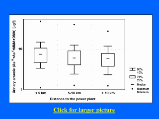 urinary arsenic in samples of the study populatioon by distance to the power plant: higher