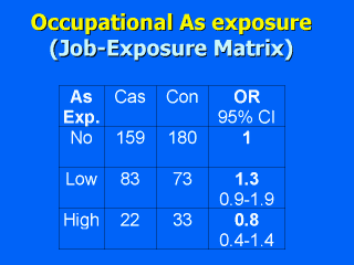 arsenic-rich coal. But the uptake of arsenic from coals remains yet to be determined. Occupational exposure to arsenic was estimated with a British job-exposure matrix (JEM): Pannett B, Coggon D, Acheson ED. A job-exposure matrix for use in population based studies in England and Wales. Br J Ind Med 1985; 42:777-83 Modifications were performed with respect to (1) the local occupational exposure conditions (arsenic rich coal and coal ash) (2) arsenic exposure according to CAREX International Information System on Occupational Exposure to Carcinogens, www.occuphealth.fi/list/data/CAREX see also: Pesch B et al. Int J Epidemiol 2000;29:1014-24 and discuss pros and cons of job-exposure matrices. |
