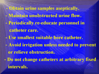 trauma . - A sterile, continuously closed drainage system should be maintained . - The catheter and drainage tube should not be disconnected unless the catheter must be irrigated . - Irrigation should be avoided unless obstruction is anticipated .Continuous irrigation of the bladder with antimicrobial has not proven to be useful and should not be performed as a routine infection prevention measure. |