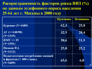| В Москве в 2000 году был проведен телефонный опрос случайной выборки населения 25-64 лет. Показатели распространенности различных факторов риска были рассчитаны для мужчин и женщин. |