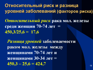 risk). Использование показателя относительного риска дает представление о том, что у пожилых женщин заболеваемость увеличивается более чем в 17 раз. Кроме относительного риска существует понятие разница уровней показателей. Эта разница указывается в абсолютных значениях. Важность этого показателя в том, что абсолютное значение превышения числа одних заболеваний над другими имеет большое значение для планирования программ, даже если относительные показатели не очень велики. Например, увеличение в два или даже три раза редких заболеваний может быть не столь важным с точки зрения общественного здоровья. При высокой распространенности заболевания даже относительно небольшое увеличение относительного риска ведет к значительному увеличению числа заболеваний. |