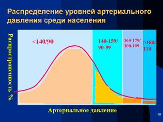 | На примере распределения уровней АД в популяции можно представить популяционный атрибутивный риск различных уровней АД. Более половины лиц с повышенным АД – это имеющие «мягкую» АГ. Остальные лица с АГ – это группа, относящаяся к умеренной и тяжелой АГ. Несмотря на то, что относительный риск смерти умеренной и тяжелой АГ больше, на популяционном уровне вклад ее в общественное здоровье меньше, чем мягкой АГ из-за высокой распространенности последней. |
