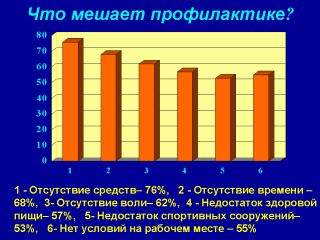 сотрудничества, 1997г.) При анализе ответов на вопрос можно заключить, что основная причина низкой эффективности профилактических вмешательств связана с отсутствием средств и времени. Эти аспекты социально значимые и связаны с социально-экономическим условиями в стране и они достаточно трудно поддадутся быстрому устранению. В тоже время, другие причины более легко устранимы, особенно касающиеся воли или привычек человека, здоровой пищи и физической активности. В данном случае основное место должно уделяться образовательным программам не только для населения, но и для обучающих. |