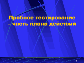 тестирование: - Позволяет выявить недостатки и скорректировать план действий. - Снижает риск потерять ресурсы, позволяет вовремя сэкономить ресурсы. - Проводится на небольшой популяции. - Используются для оценки чаще качественные показатели. Пробное тестирование является также одним из принципов социального маркетинга. При недостатке ресурсов всегда должно проводиться пробное тестирование. |