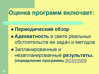 Оценка программы заключается также в периодическом обзоре деятельности, т.е. оценке внедрения программы и определении адекватности задач и применяемых методов применительно к конкретным условиям. При постановке задач программы необходимо думать над тем, насколько эти задачи достижимы и определимы, т.е. измерены.