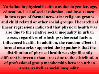The effects on physical health of two micro dimensions of risks – personal health habits and social connectivity –were predicted better by the multilevel model because the significant structural effect was included in the hierarchical regression. Social cohesion was a significant predictor of physical health in both regression models. Educational status, health habits (except alcohol use), and social support were not significant variables in the logistic model.