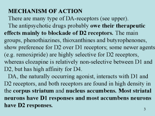 appear to be exclusively the D2 subtype. Mechanisms of action different DA- receptors see below. Recent cloning experiments expanded the family of DA receptors subtypes - D3, D4, D5.. There are found primarily in limbic areas (D3), medulla and frontal cortex (D4) or hippocampus (D5). All antipsychotics (exempt clozapine like) have potent D2 receptor blocking action; antipsychotic potency has shown good correlation with their capacity to bind to D2 receptor. Phenothiazines and thioxanthines also block D1, D3 and D4 receptors. Blockade of DA-ergic projections to the mesolimbic system and mesocortical areas is probably responsible for the antipsychotic action (because DA overactivity in limbic area is responsible for exacerbate schizophrenia). |