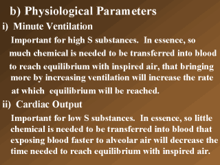 Diffusion Capacity Since the vapor must move across the alveolar-capillary membrane, a limitation due to diffusion may occur. This is not so for solvents being investigated. There is sufficient time for an equilibrium to occur between the two compartments. Therefore an equilibrium is assumed to exist at all times between alveolar air and capillary blood. iv) Amount of Blood and Body Water to be Saturated 5 liters and total body water, 40 liters. v) Amount of Fatty Tissue to be Saturated » 15% of bw vi) Biotransformation or Metabolism To the extent that a chemical is metabolized, this will reduce its amount in blood and therefore uptake will continue. Usually this is via an enzymatic saturable pathway and will be important at low concentration. At high concentration the amount of chemicals metabolized will be too low to influence the equilibrium concentration in blood. |