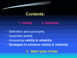 | There are four parts in the content of the lecture. 1. Definition and synonyms of validity & reliability 2. Important points of validity & reliability 3. How to access validity & reliability 4. Strategies to enhance validity & reliability |