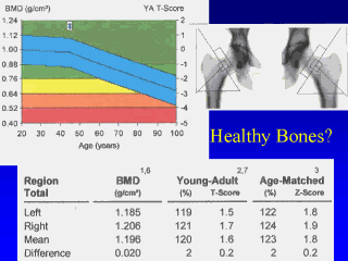 | This slide depicts the results of a hip DXA scan on a 45 year old woman. To interpret this DXA scan, compare the subject’s T score to the cutpoints in the previous slide. The Z score compares her scan data to what would be expected in her age group. Yes, she has “healthy” hips. |