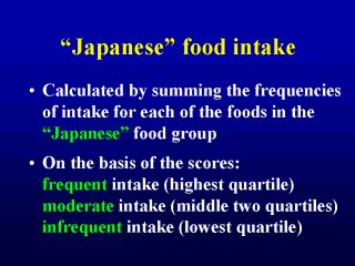 A Japanese food intake score, and Japanese food intake groups, were defined in the same way using Japanese foods. The Cronbach alpha value was 0.78 for Japanese foods. There was little evidence that the Japanese and Western food intake variables had potential for collinearity (Spearman correlation coefficient=0.28).