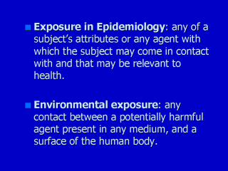 Exposure in Epidemiology can also be food, antibodies, screening, and treatment.
