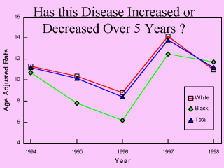 shown in this figure is increasing over the 5 year period? How many decreasing? You can tell if the data is increasing or not by using a statistical technique called regression analysis to fit the data to a straight line. A positive rate of change indicates that this disease is increasing, which is bad. A negative rate of change indicates that the disease is decreasing, which is good. |