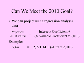 eliminating all racial/ethnic disparities by 2010. If you have 5 data points on a graph, you can get a ruler and try to draw a straight line that fits them all. Regression Analysis uses math to create do this. It creates the best straight line which fits the data. Regression Analysis is often used for creating models, which then can be used to predict the future. Our simplified analysis is not a very good model. The events which effected health in the past 5 years may not continue into the future. However, you can use Regression Analysis to make a prediction, as long as you don’t take it too seriously without further study. The regression analysis can be used to create the mathematical formula on the slide. The Intercept Coefficient and X Variable Coefficient are copied directly from the Regression Analysis results. 2010 represents a year, such as 2010, and the numerical value of that year, 2,010. In our example, 7.64 people per 100,000 are expected to die from colorectal cancer. 7.64 = 2,721.14 + (-1.35 x 2,010) 7.64 = 2,721.14 - 2,713.50 Predictions based on a linear projection of data may not be valid, but the should give something to think about. They re a starting point, not an end point. |