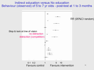 as trainers on the observed behaviour of one age group. The horizontal scale is logarythmic and goes from 0.1 to 10 with the solid line on 1 meaning there is no difference in effectiveness between intervention and control groups. A result at the right of this line favors the intervention group. First you notice the 17 different outcomes and conditions in which they were measured from 4 RCTs. The dots are the point value of the RR that represent the relative probability of children having the correct expected behaviour. The lines are the 95%CI. Overall the impression is that these indirect educational programmes were effective in improving children’s behaviour although not for each outcome. The importance varies a lot. To emphasize the importance of the conditions of outcome measurement, we will look at one study (Limbourg in Germany) showed that: Trained children were more likely to stop & look at the line of vision than the control group with a factor of 1.4 if measured without distraction, but it increased to 4 when measured in a competitive condition. |
